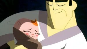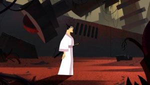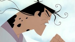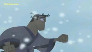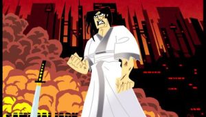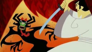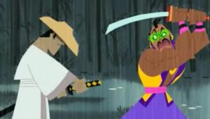 مع سيف والده السحري كاتانا، تحدي أكو إلى مبارزة ليهزم الشرير, ومع ذلك قبل أن يتمكن جاك من ضربة الضربة القاتلة قام أكو بإنشاء بوابة الزمن ويرسل خصمه في المستقبل البعيد، وتوقع أنه سيكون قادرا على حشد قوة كافية للتعامل مع السامرائي في وقت لاحق.